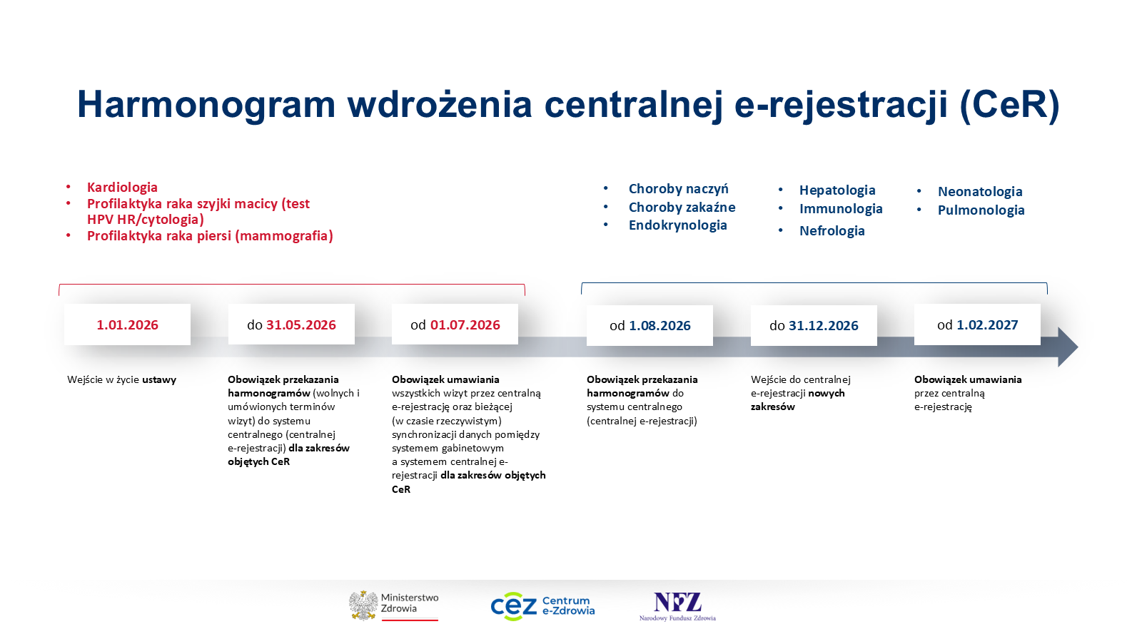 Ustawa dotycząca e-rejestracji weszła w życie 1 stycznia 2026 r. Wprowadziła obowiązek podłączenia się do centralnej e-rejestracji dla wszystkich placówek, które realizują świadczenia w zakresach: